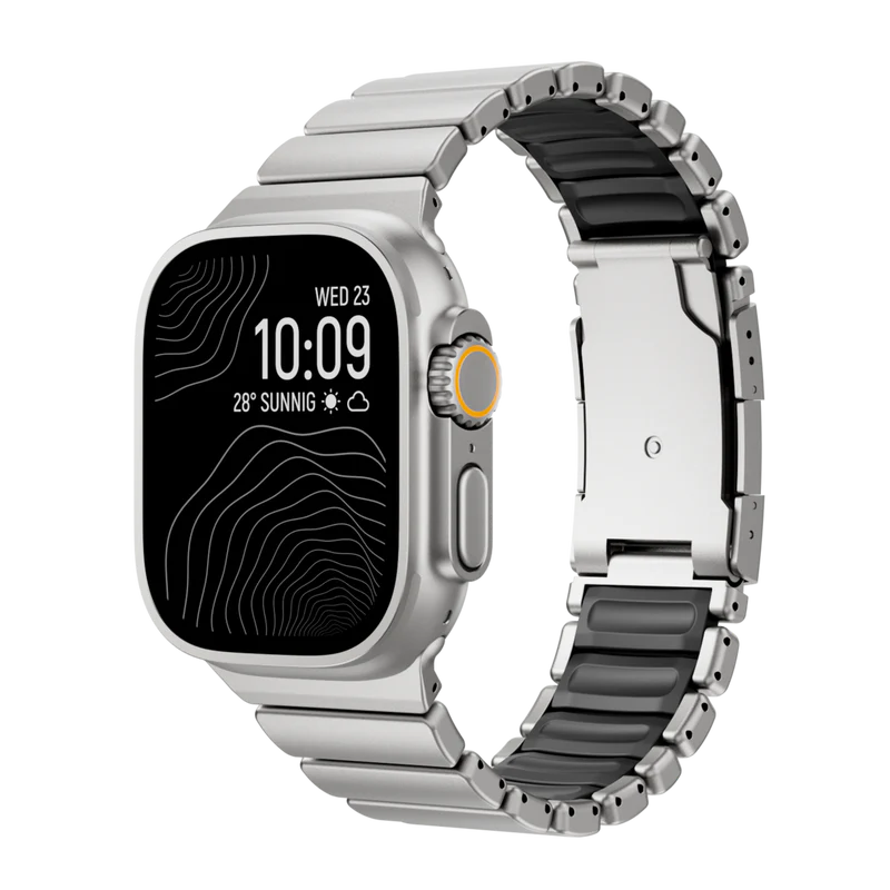 Une intégration parfaite. Pensé exclusivement pour l’Apple Watch Ultra, ce bracelet se distingue par ses maillons polis aux finitions arrondies. Son aspect mat a été travaillé pour s'accorder précisément avec la teinte naturelle du boîtier en titane de votre montre, créant un look cohérent, robuste et raffiné.